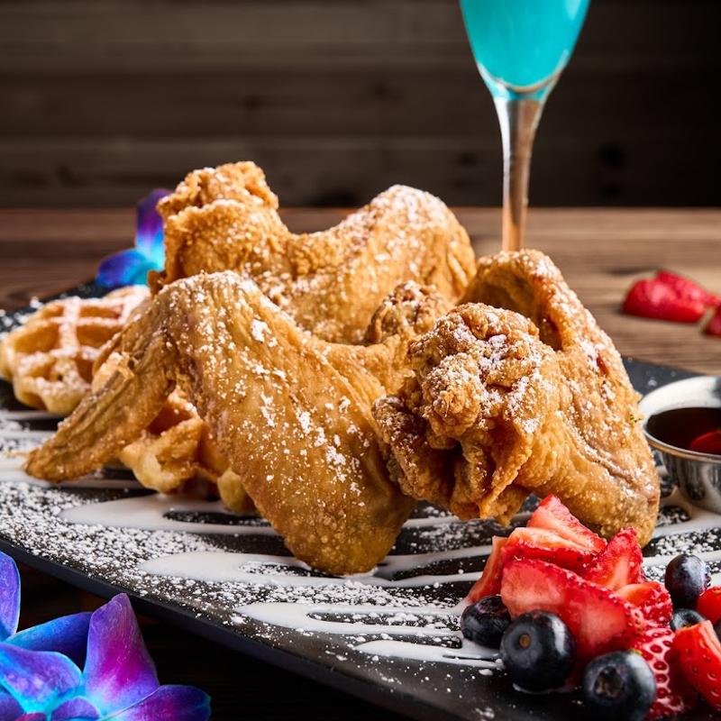Chicken & Waffles. 3 Whole Wings Deep Fried with Two Waffles Topped with Fresh Seasonal Berries & Powdered Sugar